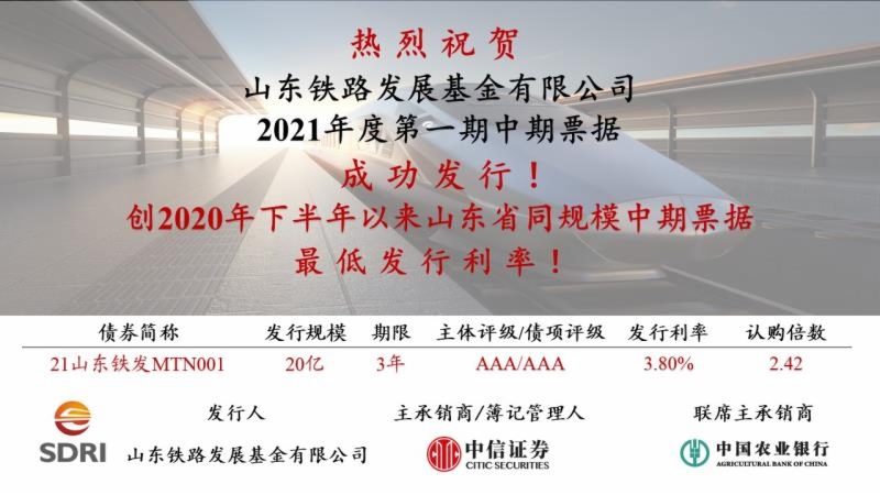 近日,山东铁路发展基金有限公司(以下简称“基金公司”)在中国银行间市场交易商协会成功发行20亿元中期票据。本次发行共吸引了国内29家投资者参与投资,认购倍数为2.42,累计申购量达到48.4亿元,最终发行成本为3.8%,期限为3年,创2020年下半年以来山东省同规模中期票据发行利率最低。