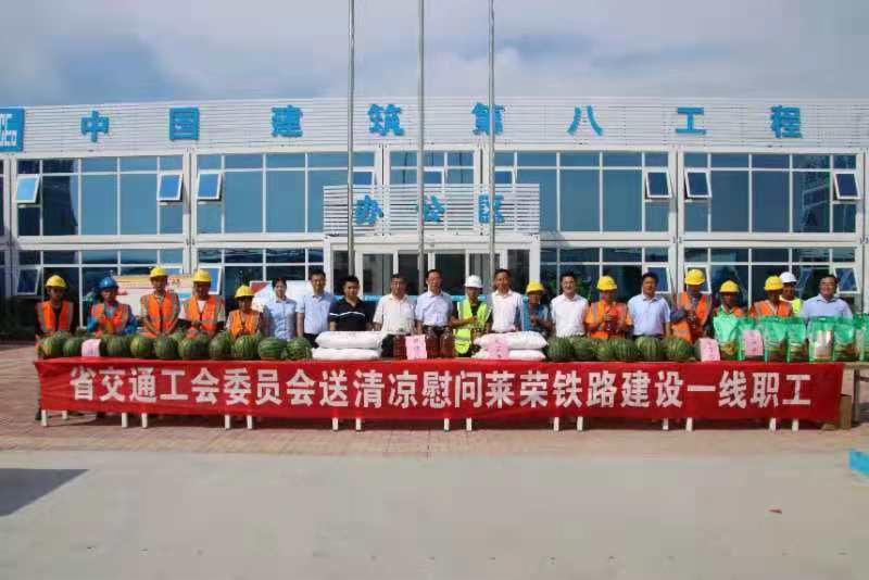 7月22日正值大暑节气,省交通工会副主席王迎军一行,赴莱荣高铁建设一线开展“2021年学党史、办实事、送清凉”活动,为高铁建设一线职工送去防暑降温用品。集团工会主席张庆星陪同。