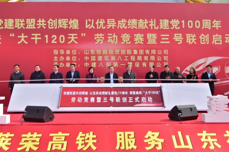 近日,济青高铁公司、威海市发改委、乳山市发改局、南海新区经发局、文登区发改局,以及中建八局一公司莱荣高铁项目部,在莱荣高铁开展“党建联建共创辉煌 以优异成绩献礼建党100周年”劳动竞赛暨“三号”(党员先锋号、工人先锋号、青年文明号)联创、党建联盟启动仪式,结合日前开展的“大干120天,喜迎建党100周年”劳动竞赛,莱荣高铁建设按下“加速”键。