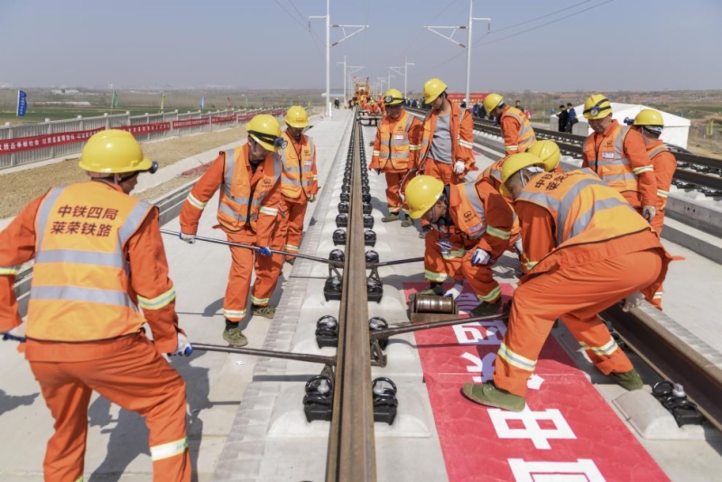 莱荣高铁正线长度 192.814km,其中铺设无砟轨道地段 180.999km。自2022年3月下旬无砟轨道工程全面转入线上施工以来,莱荣高铁公司充分发挥党建引领作用,精心组织,细化安排,充分优化资源配置,全线高峰时段38个作业面同时施工,作业人员高达1500余人。各参建单位齐心协力克服了工作面多、作业班组多、施工组织难度大、不良天气频发和疫情防控等不利因素影响,仅用不足400天时间顺利完成全线无砟轨道施工任务。目前莱荣高铁铺轨已完成近半,计划6月初完成钢轨放散锁定,7月初开始联调联试,10月底具备开通运营条件。