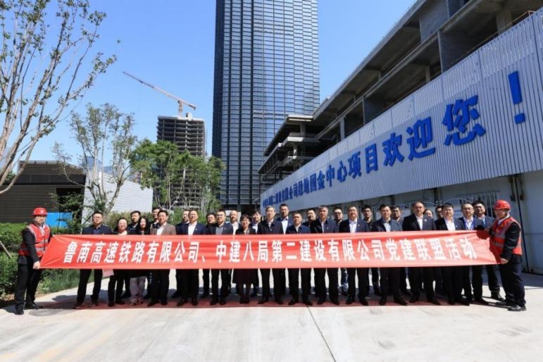 4月26日,鲁南高铁公司组织党员来到绿地山东国际金融中心项目建设现场,与中建八局二公司共同开展了党建共建暨“登齐鲁之巅,怀赤色匠心,做鲁南尖兵”主题党日活动。鲁南高铁公司党委副书记、总经理孙韶峰,党委副书记、监事会主席、工会主席王清村;中建八局山东分局副局长靳庆玉,二公司副总经理苑玉振,党委副书记、工会主席张慧,基础设施公司党总支书记、总经理吕士东,山东公司党总支副书记、执行总经理高腾等参加活动。