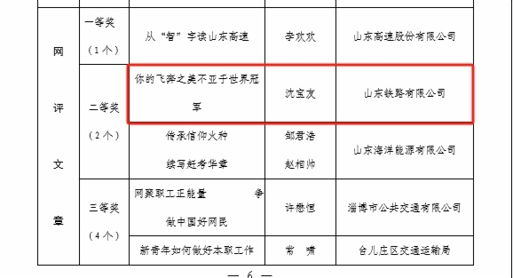 在“网聚职工正能量 争做中国好网民”新媒体原创作品评选中,济青公司刘杰同志《傍晚下的劳作》荣获摄影类一等奖;铁路公司马骏同志《傍晚的泉城》荣获摄影类二等奖;济青公司宋磊同志《莱荣高铁铺轨》荣获摄影类三等奖;鲁南公司集体创作《永远跟党走》荣获歌曲类二等奖;鲁南公司董星辰同志《我是第一书记》荣获微视频类三等奖;基金公司集体创作《破圈》荣获诵读类二等奖;铁路公司沈宝友同志《你的飞奔之美不亚于世界冠军》荣获网评文章类二等奖。