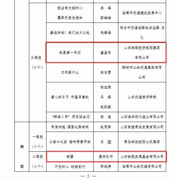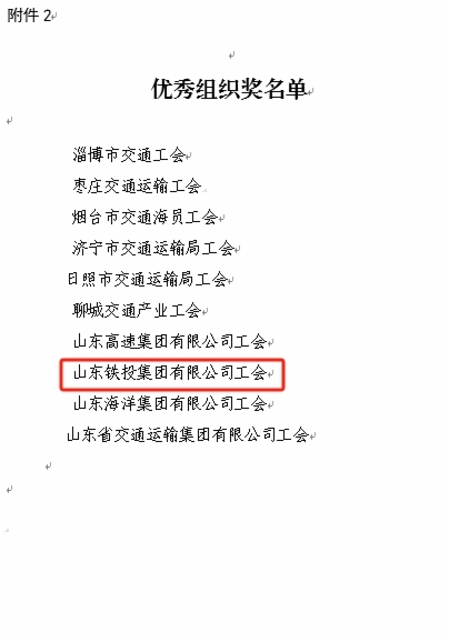 近日,由山东省交通工会举办的“网聚职工正能量 争做中国好网民”新媒体原创作品大赛和“书香三八”读书活动评选结果揭晓。集团工会选送的11个作品获奖,集团工会荣获两个活动优秀组织奖,受到省交通工会通报表扬。