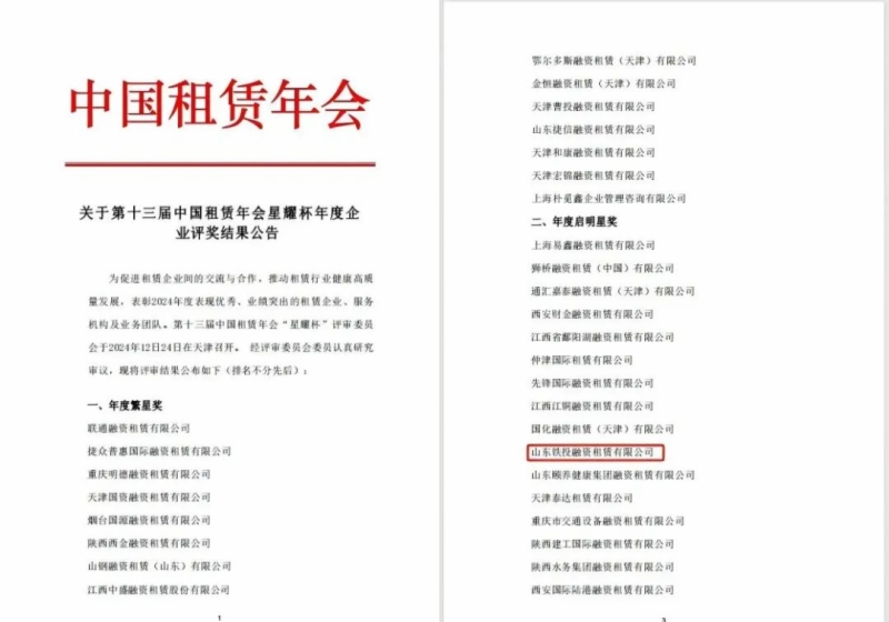近日,在第十三届中国租赁年会“星耀杯”年度企业评选中,9428cn太阳集团古天乐所属铁投租赁公司斩获“年度启明星”奖,该奖项旨在突出企业实施战略转型期间,对行业具有影响力和贡献力,能够树立良好榜样的企业。这也是铁投租赁公司2024年度继获得山东省融资租赁公司“高质量发展奖”荣誉称号后,获得的第二项年度荣誉。