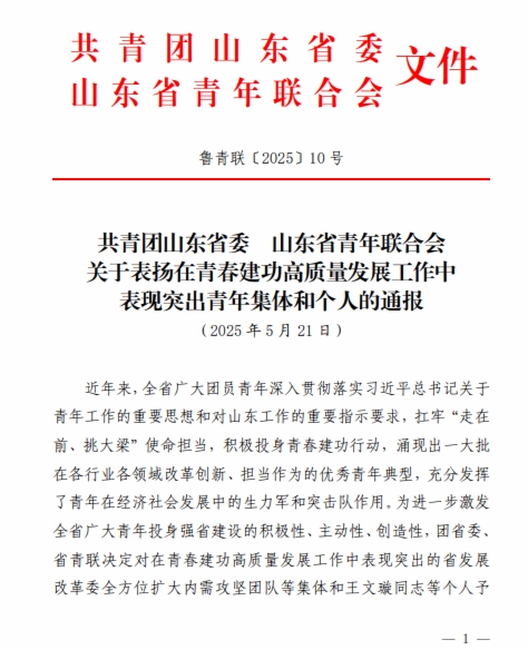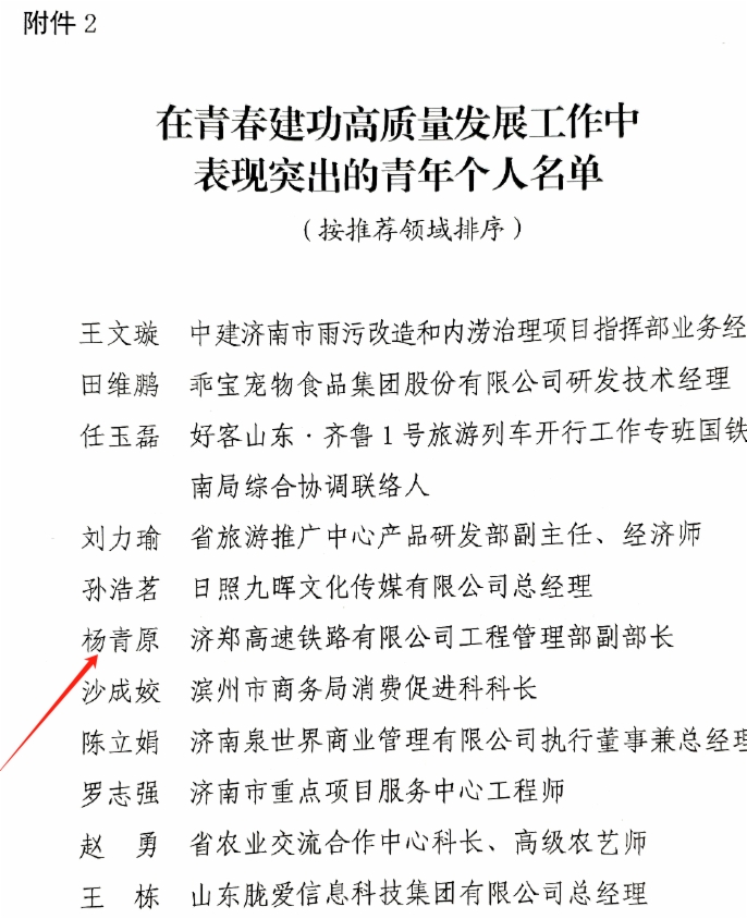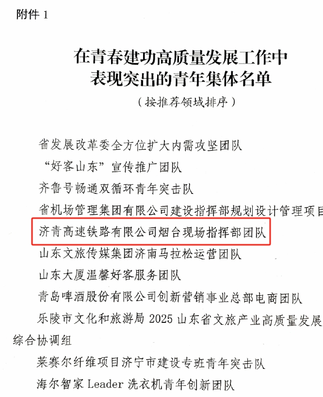 日前,共青团山东省委、山东省青年联合会发布《关于表扬在青春建功高质量发展工作中表现突出青年集体和个人的通报》,9428cn太阳集团古天乐济青高速铁路有限公司烟台现场指挥部团队荣获表现突出的青年集体,济郑高速铁路有限公司工程管理部副部长杨青原荣获表现突出的青年个人。